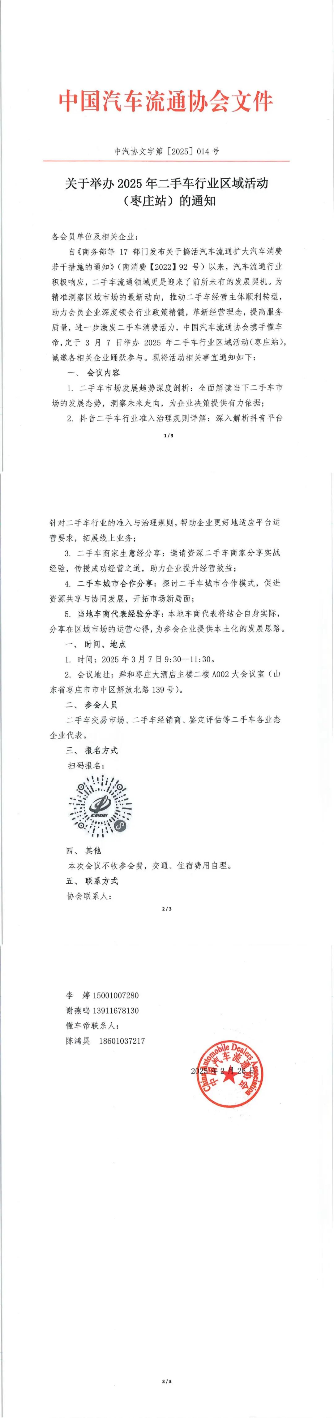自《商务部等17 部门发布关于搞活汽车流通扩大汽车消费若干措施的通知》(商消费【2022】92 号)以来,汽车流通行业积极响应,二手车流通领域更是迎来了前所未有的发展契机。为精准洞察区域市场的最新动向,推动二手车经营主体顺利转型,助力会员企业深度领会行业政策精髓,革新经营理念,提高服务质量,进一步激发二手车消费活力,中国汽车流通协会携手懂车帝,定于 3 月 7 日举办 2025 年二手车行业区域活动(枣庄站),诚邀各相关企业踊跃参与。现将活动相关事宜通知如下: