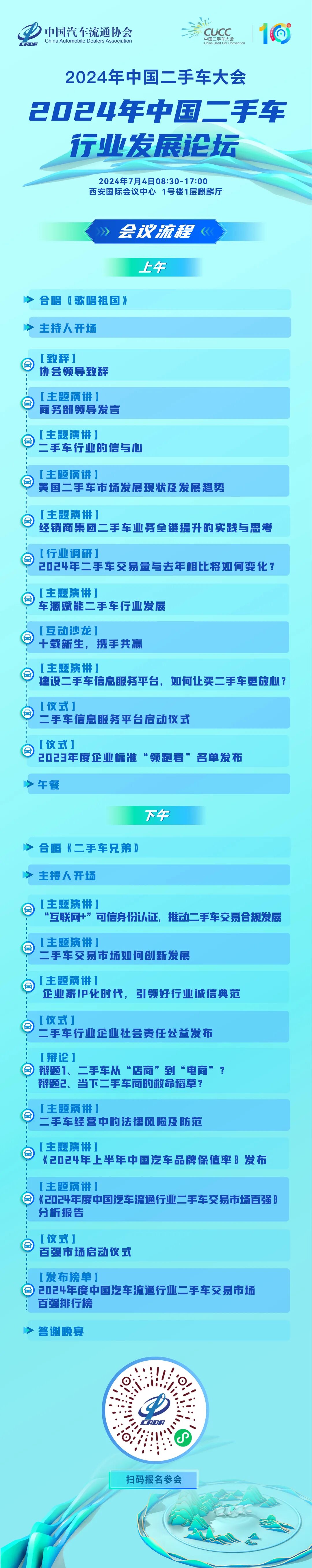 2023年,我国二手车市场在诸多利好政策推动下累计交易量刷新了历史交易量新高。二手车市场逐渐向规范化、专业化、规模化和集团化方向发展,市场活力正在被逐步激发。然而,受全球经济形势变化,市场环境波动等多重因素影响,行业仍面临一系列新的挑战和危机。二手车行业诚信建设、二手车经营中的法律风险、国际二手车商品化发展历程、二手车交易市场如何焕发新生、经销商集团二手车业务的全链路发展、二手车经销商新的竞争优势、新能源二手车发展探索、二手车出口新风口、机动车拍卖规模化发展、营销策略新途径……行业的发展还有诸多需要行业同仁共同去解决的问题,2024年中国二手车大会,7月3-5日,我们以“强基立于信 行远守于心”为主题一起思变求进,向新而行!