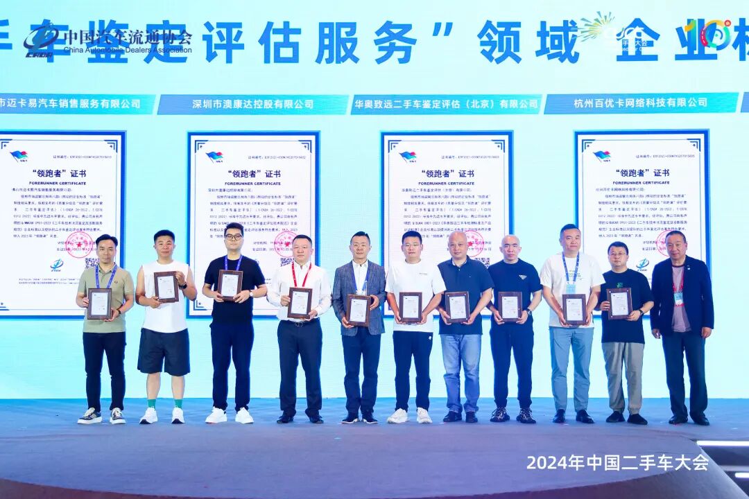 论坛揭晓了经过层层筛选,最终脱颖而出的10家2023年度“二手车鉴定评估服务”企业标准“领跑者”,他们分别是:深圳市澳康达控股有限公司、华奥致远二手车鉴定评估(北京)有限公司、佛山市迈卡易汽车销售服务有限公司、北京精真估信息技术有限公司;中质研(北京)标准化服务有限公司;杭州百优卡网络科技有限公司;安徽明鑫商业运营管理集团有限公司;广州晓波严选汽车服务有限公司;山西卡乃驰壹加壹汽车销售服务有限公司;太原大林好车汽车销售服务有限公司,他们代表了二手车行业的最高标准和规范,同时也为二手车市场的透明化、规范化树立了标杆。中国汽车流通协会会长沈进军为以上企业颁发企业标准“领跑者”证书。