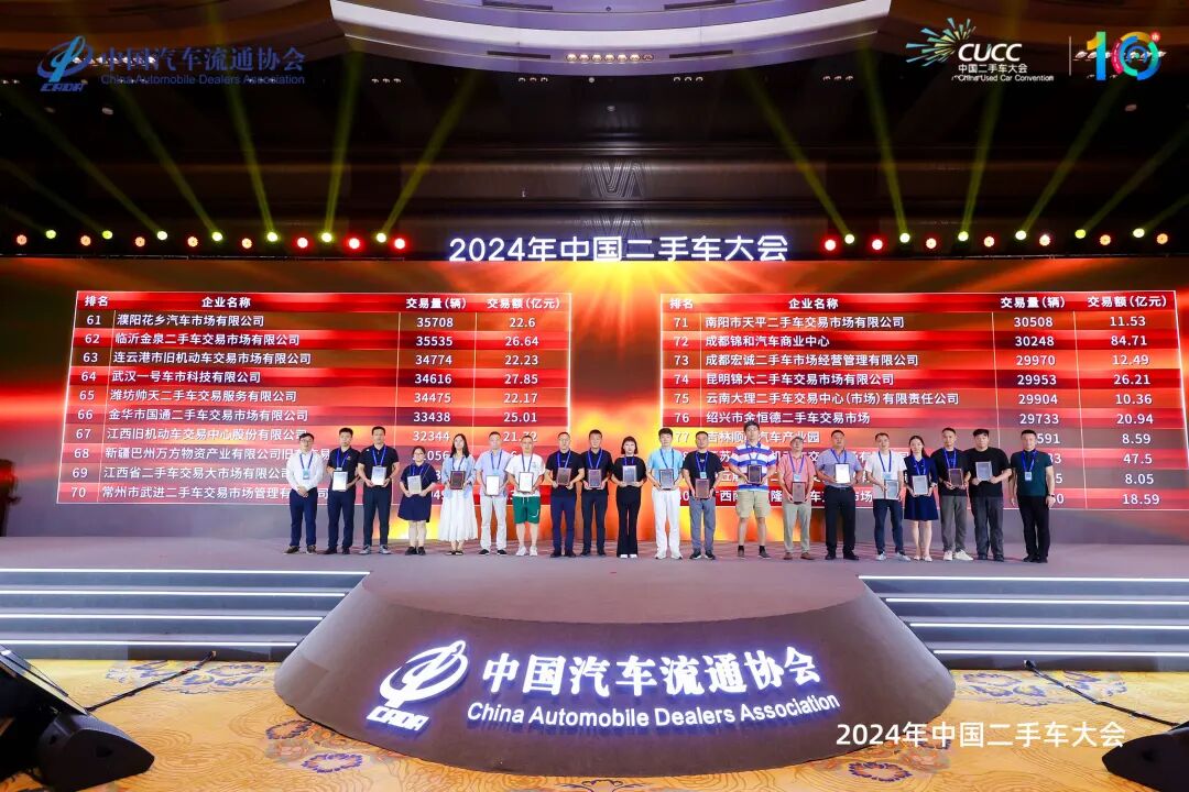 论坛尾声,中国汽车流通协会会长沈进军、副会长兼秘书长肖政三、会长助理宋涛、会长助理罗磊、会长助理刘文姬,西安市汽车流通协会会长张建华、陕西省物资再生利用行业协会会长惠红钊、青岛市汽车行业联合会会长倪绪滨共同启动了2024年度中国汽车流通行业二手车交易市场百强排行榜发布仪式,并为上榜企业颁发荣誉证书。