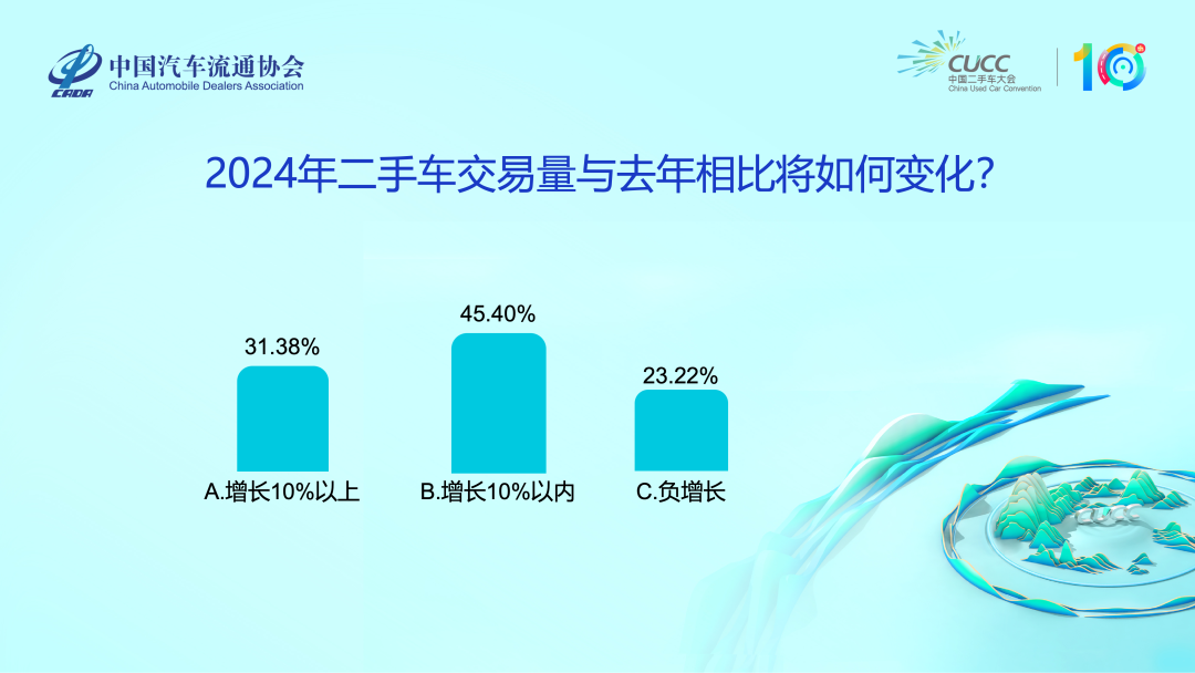 在现场的行业调研环节,针对“2024年二手车交易量与去年相比将如何变化”的问题,与会人士投票显示,认为增长10%以上的有31.38%;增长10%以内的有45.40%;认为负增长的有23.22%。
