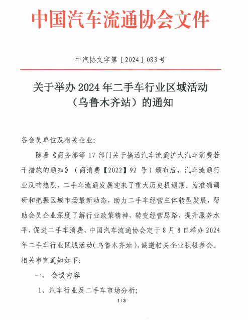 随着《商务部等17部门关于搞活汽车流通扩大汽车消费若干措施的通知》(商消费【2022】92号)颁布后,汽车流通行业反响热烈,二手车流通发展迎来了重大历史机遇期。为准确调研和把握区域市场最新动态,助力二手车经营主体转型发展,帮助会员企业深度了解行业政策精神,转变经营思路,提升服务水平,促进二手车消费,中国汽车流通协会定于8月8日举办2024年二手车行业区域活动(乌鲁木齐站),诚邀相关企业积极参会。相关事宜通知如下: