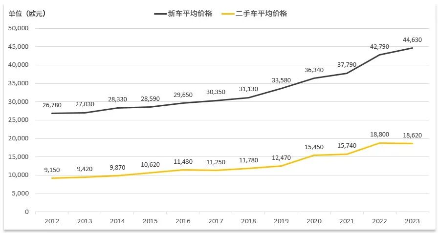 和欧洲的平均价格走势不同,德国二手车在持续涨价。2019年之后,价格涨幅有所提高。来自DAT的数据显示,近20年来,德国新车和二手车的价格除2009年金融危机造成了市场动荡之外,均呈上升走势。其中2021至2022年的上涨趋势尤为明显,这一阶段性趋势和同一时间段的美国市场很相似,且二手车又较新车涨幅更大。2023年,德国二手车平均价格出现微降。2022年德国新车均价4.28万欧元,约为2002年(20,785欧元)的两倍,而2022年二手车均价1.88万欧元则超过2002年(7,910欧元)的两倍。2023年,新车价格继续上涨,二手车价格趋于平稳。