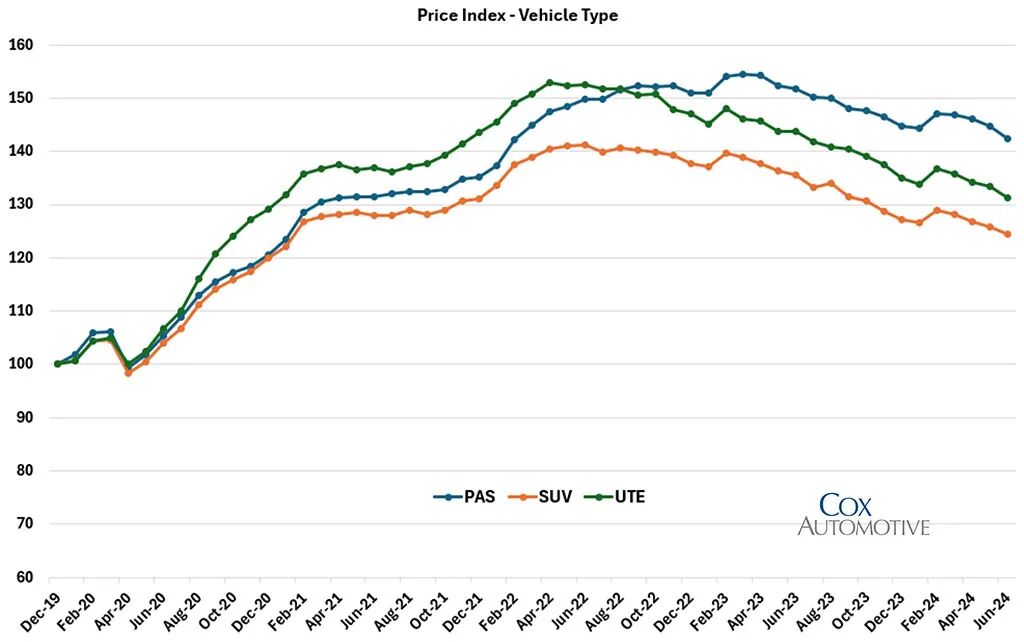 从价格上来看(上图),澳大利亚二手车价格自2022年高点后一路下跌至今。2020~2022年二手车价格则是上涨态势。截至2024年6月底,考克斯指数为131.8,表明澳大利亚二手车的市场平均售价比包括CPI在内的COVID时期之前高出31.8%。这一数字比2023年上半年末的指数水平下降了7.8%,比2022年8月市场短缺最为明显时的峰值148.1下降了11.0%。在所有售出的二手车中,38.8%的车辆在挂牌和销售之间有价格变化(折扣),平均每辆车的折扣为7.1%。与新冠疫情之前的水平(141.8)相比,乘用车价格涨幅最大,而SUV价格涨幅最小(124.4)。