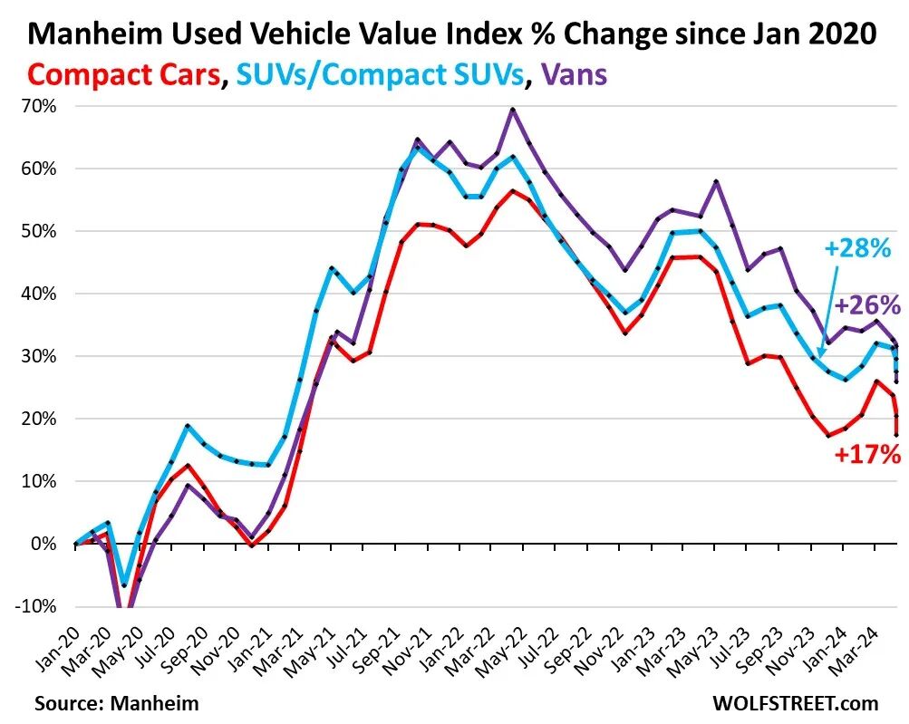 SUV和紧凑型SUV:从2020年1月到2021年11月,价格飙升了63%。随后,价格呈螺旋式下降趋势,回吐了57%的涨幅,但仍比2020年1月上涨了26%。商务车型:截至2022年5月,价格飙升了70%,随后回落了63%,但仍比2020年1月上涨了26%。紧凑型汽车:价格从2020年1月到2022年5月上涨了56%,然后下跌。到目前为止,已经回吐了疫情期间69%的涨幅,与2020年1月相比“仅”上涨了17%。