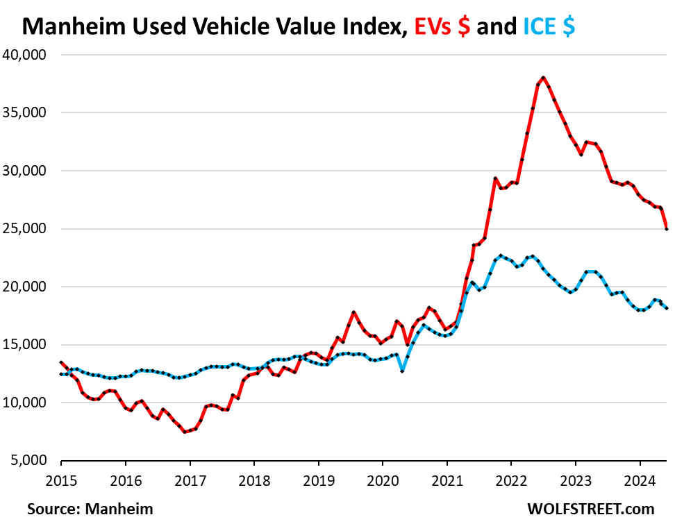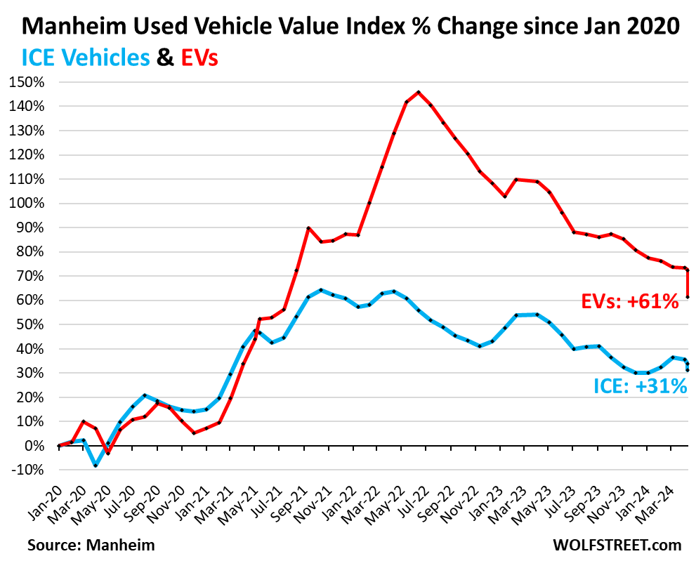 从2020年1月到2022年5月的峰值,拍卖价格未经季节性调整,飙升了令人难以置信的65%,即9,088美元,然后开始螺旋式下降,到现在已回落了52%。但从另一个角度看:自2020年1月以来,尽管批发价格正在经历历史性的暴跌,但批发价格仍比2020年1月高出32%。以下数据未经季节性调整:从这个方向来看,自2020年1月以来,电动汽车价格仍上涨了61%(下图中红色)。内燃机汽车价格仍上涨了31%(下图中蓝色):