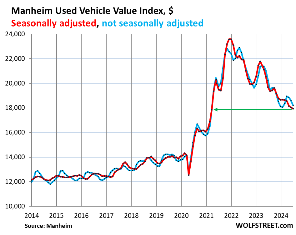 今年6月份,全美拍卖会上出售的二手轿车、SUV、皮卡和货车的价格较5月份下跌0.6%,同比下跌8.9%,经季节性调整后至17,934美元,为2021年3月以来的最低水平。在2020年1月至2022年5月期间9,443美元的涨幅中,二手车价格已回落60%,即5,640美元(下图中红色)。根据美国最大的汽车拍卖行美瀚(Manheim)近日发布的二手车价值指数显示,未经季节调整,6月份批发价格较5月份下跌2.2%,同比下跌10.0%,至18,206美元(下图中蓝色),在2020年1月至2022年5月期间的9,088美元涨幅中,下跌了52%,即4,690美元。该指数根据数据组合和里程的变化进行了调整。