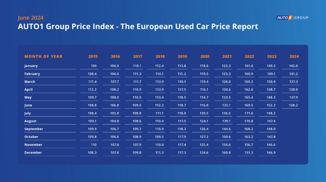 与其他车型相比,紧凑型汽车现在最接近疫情前的趋势。紧凑型汽车的指数价格为9,500美元,与9年前,即2015年6月相比同样“仅”上涨了17%。但美国人并不是紧凑型汽车的粉丝。因此,新款紧凑型汽车的零售需求仍然温和;大买家是租赁车队。对于汽车制造商来说,紧凑型车是一个利润率低、竞争激烈的细分领域。美国汽车制造商退出紧凑型燃油汽车市场,因为他们难以从中赚钱,更愿意通过股票回购向华尔街屈服。最近市场上的紧凑型燃油汽车几乎都是外国品牌。在较旧的紧凑型汽车中,也有美国品牌。但由于这些动态,二手紧凑型汽车再次回到可负担的价格。二手车价格下跌有几个原因:一是新车价格稳定或下降。二是去年美国道路上行驶的汽车平均使用年限为12.6年,创历史新高。人们保留旧车是因为他们想节省购买新车或二手车的成本。此外,汽车的制造工艺比过去几十年更好。越来越多的人拥有行驶里程超过10万英里的汽车。随着新车销量持续上升、价格下降,二手车价格上涨的压力将逐渐消失。美国业内人士指出,随着选择增多,一些消费者似乎仍对电动汽车犹豫不决,电动汽车价格也大幅下跌,二手电动汽车价格在过去一年下跌了16.6%。目前,美国电动汽车领域的整体供需基本面似乎仍然疲软。在疫情期间供应链出现问题后,汽车库存反弹,促使经销商提高新车促销力度。这一转变导致二手车价格暴跌,皮卡价格下跌8.3%,SUV价格下跌9.3%,轿车价格下跌11%。根据Edmund的数据,2023年第四季度二手车平均交易价格较2022年下降28,371美元。此前,高需求阻止了二手车贬值,但疫情导致的持续短缺限制了新车生产,导致二手车供应减少。由于无法增加供应,这种稀缺性使得二手车的价值保持较高水平。AUTO1集团价格指数显示了欧洲各地二手车价格的月度变化情况。通过分析AUTO1集团约420万笔欧洲二手车交易的数据库,AUTO1集团开发了一个开创性的指数,以提高二手车市场的数据透明度并深入了解批发价格。AUTO1集团价格指数的起点是2015年1月,参考值为100。AUTO1集团价格指数每月发布一次。