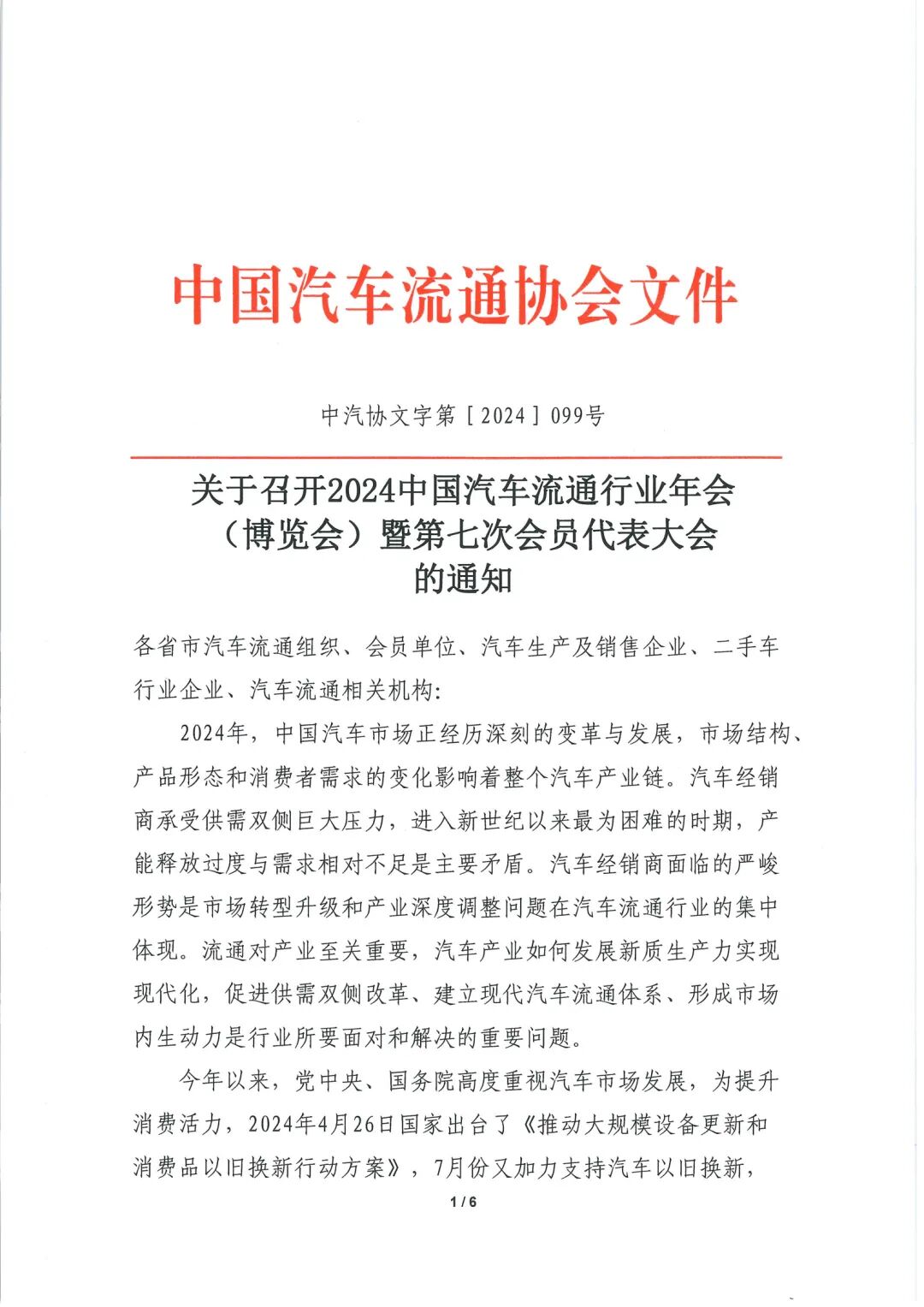 关于召开2024中国汽车流通行业年会(博览会)暨第七次会员代表大会的通知