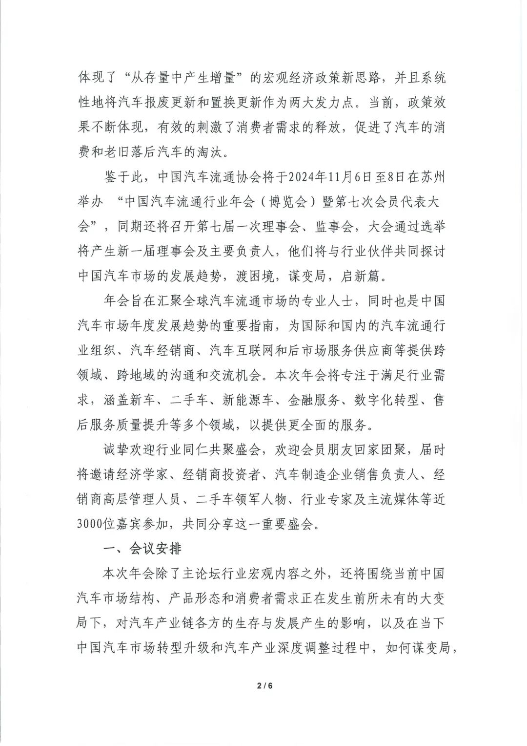 各省市汽车流通组织、会员单位、汽车生产及销售企业、二手车行业企业、汽车流通相关机构: 2024年,中国汽车市场正经历深刻的变革与发展,市场结构、产品形态和消费者需求的变化影响着整个汽车产业链。汽车经销商承受供需双侧巨大压力,进入新世纪以来最为困难的时期,产能释放过度与需求相对不足是主要矛盾。汽车经销商面临的严峻形势是市场转型升级和产业深度调整问题在汽车流通行业的集中体现。流通对产业至关重要,汽车产业如何发展新质生产力实现现代化,促进供需双侧改革、建立现代汽车流通体系、形成市场内生动力是行业所要面对和解决的重要问题。今年以来,党中央、国务院高度重视汽车市场发展,为提升消费活力,2024年4月26日国家出台了《推动大规模设备更新和消费品以旧换新行动方案》,7月份又加力支持汽车以旧换新,体现了“从存量中产生增量”的宏观经济政策新思路,并且系统性地将汽车报废更新和置换更新作为两大发力点。当前,政策效果不断体现,有效的刺激了消费者需求的释放,促进了汽车的消费和老旧落后汽车的淘汰。鉴于此,中国汽车流通协会将于2024年11月6日至8日在苏州举办