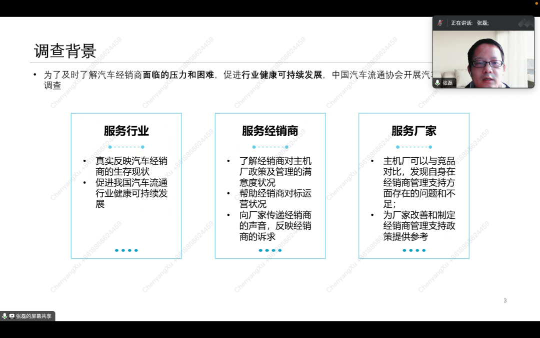 协会产业协调工作委员会主任张磊介绍了2024年上半年汽车经销商行业调研情况,分别从生存状况数据分析、新能源渠道模式分析、汽车售后发展趋势等方面介绍了调研数据和分析成果。