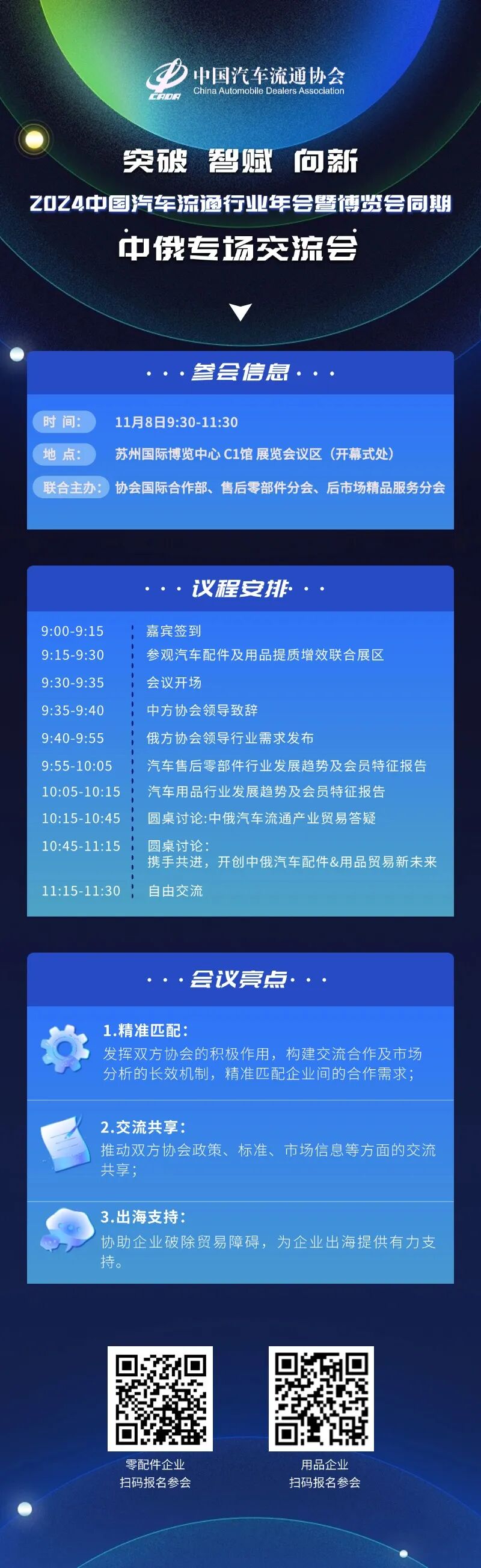 2024中俄专场交流会将于“2024中国汽车流通行业年会暨博览会”同期在苏州国际博览中心召开。中俄双方行业领袖、汽车经销商、汽车零配件及用品等企业嘉宾参会,通过参观汽车零配件及用品联合展区、主题报告、圆桌讨论、互通提问等形式,推动以下目标的达成:1.发挥双方协会的积极作用,构建交流合作及市场分析的长效机制,精准匹配企业间的合作需求;2.推动双方协会政策、标准、市场信息等方面的交流共享;3.协助企业破除贸易障碍,为企业出海提供有力支持。
