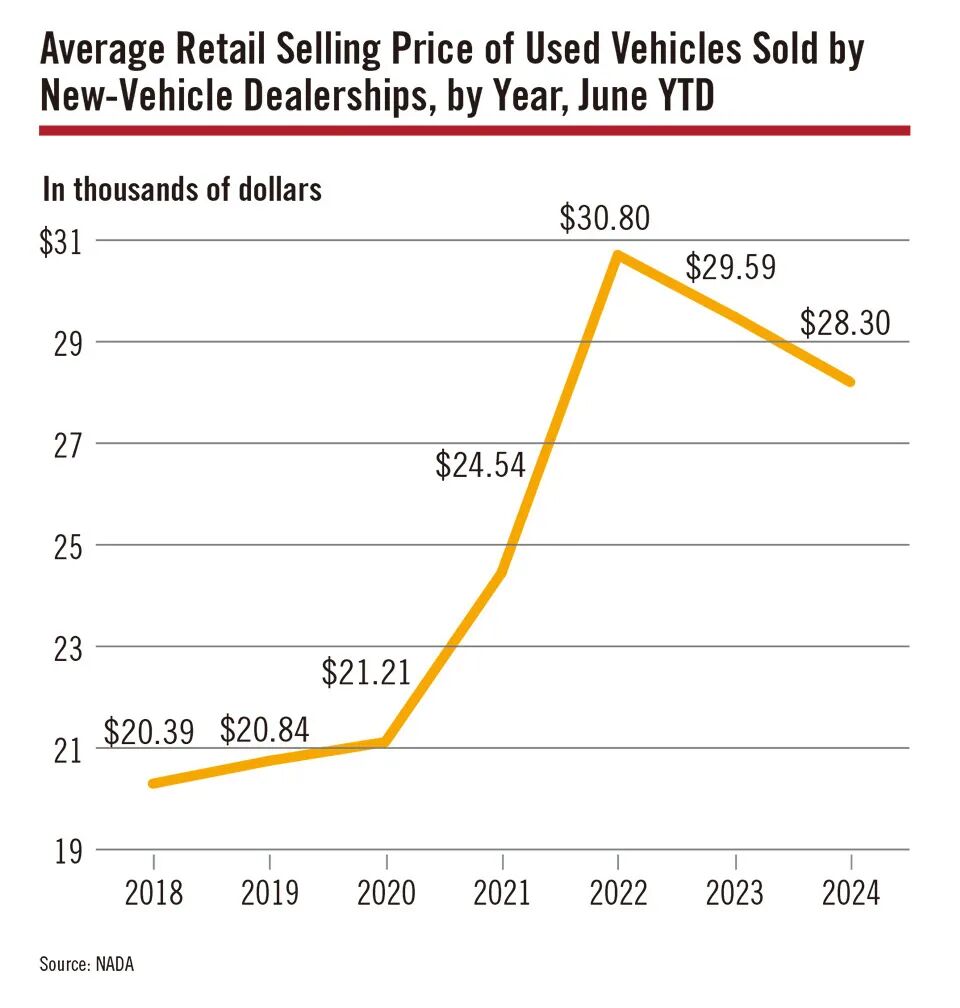 新车经销商二手车的平均价格在2022年达到高点之后开始回落,2022年上半年二手车均价高达30,800美元;2024年上半年为28,302美元。尽管均价有所下滑,但仍高于2021年上半年的24,540美元。