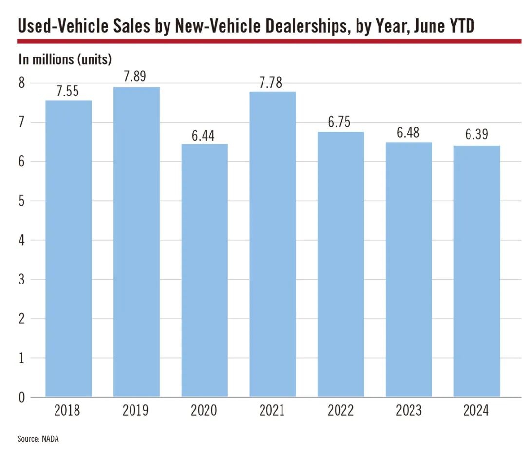 从美国新车经销商二手车年度销量来看,2024年上半年二手车销量为639万辆,为2018年以来最低。