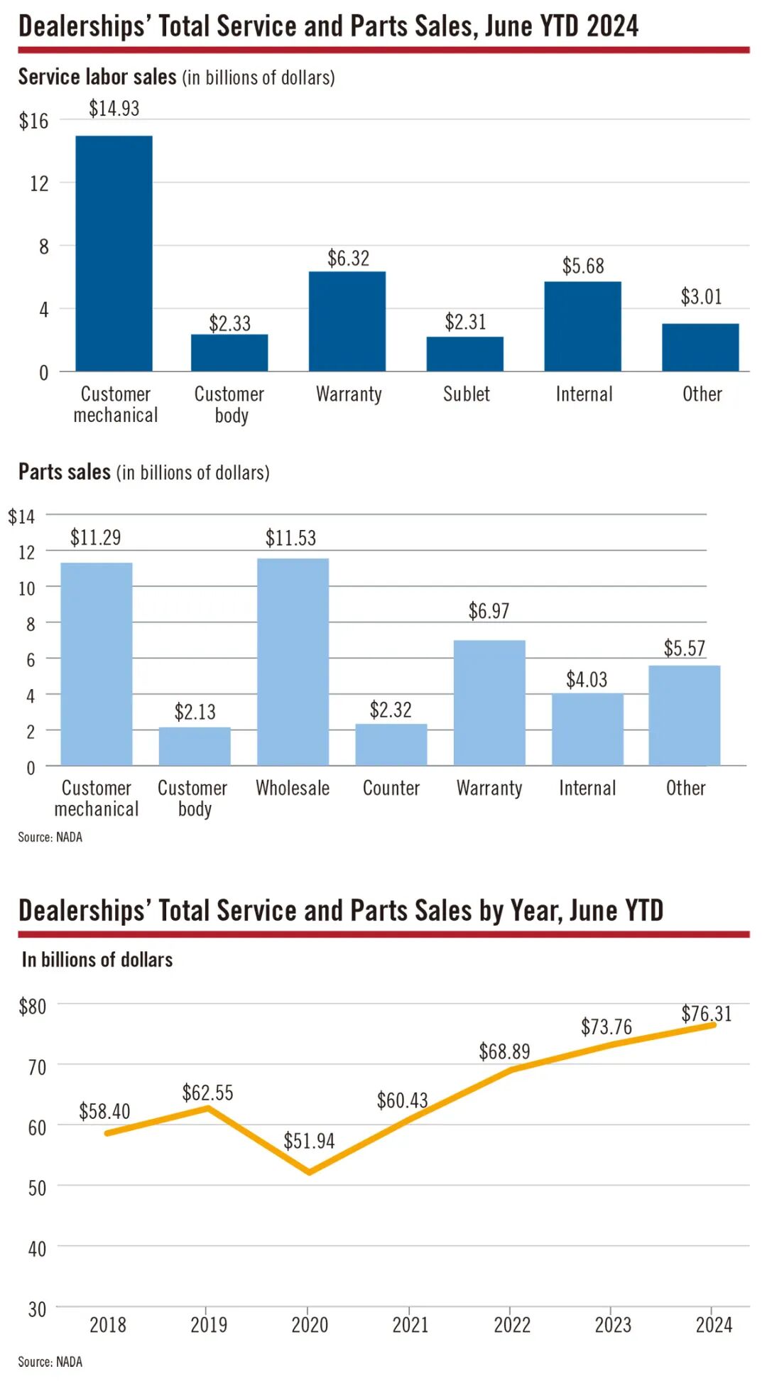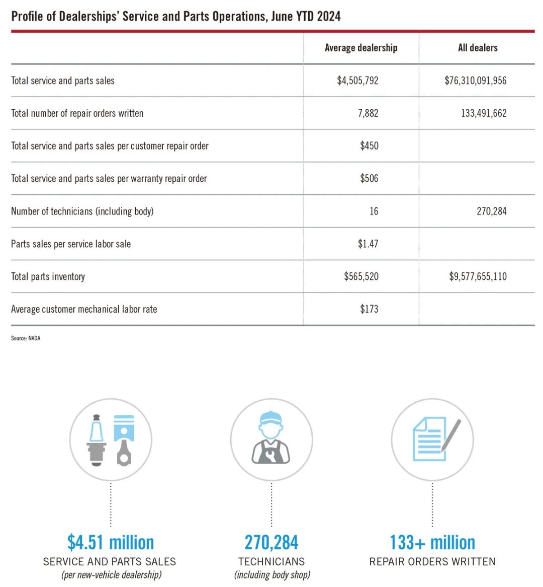 2024年上半年,美国经销商维修车间现场运营人员占总人数的比例为33.8%;经销商维修车间营业额为40.1亿美元;经销商平均单个维修订单销售额为1089美元。