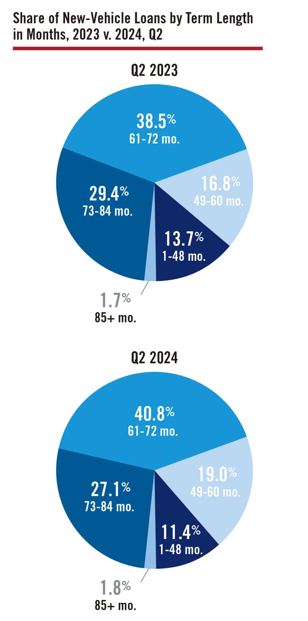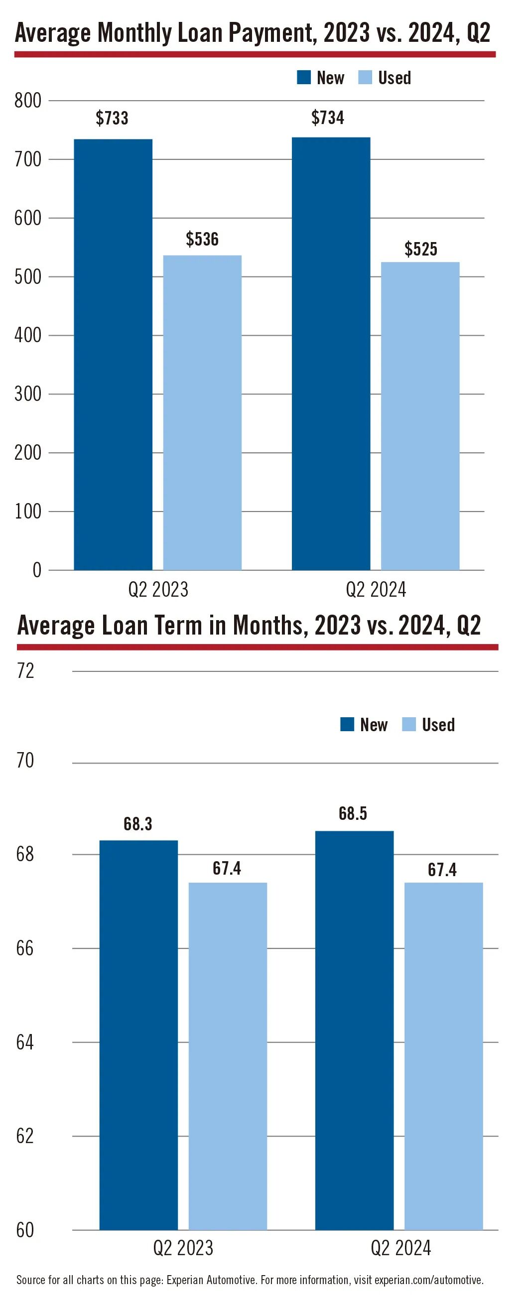 2024年第二季度,美国汽车消费者的新车和二手车平均月供分别为734美元和525美元,与上年同期相比变化不大;2023年和2024年第二季度平均贷款期限对比显示,2024年第二季度平均贷款期限新车为68.5个月,二手车为67.4个月。