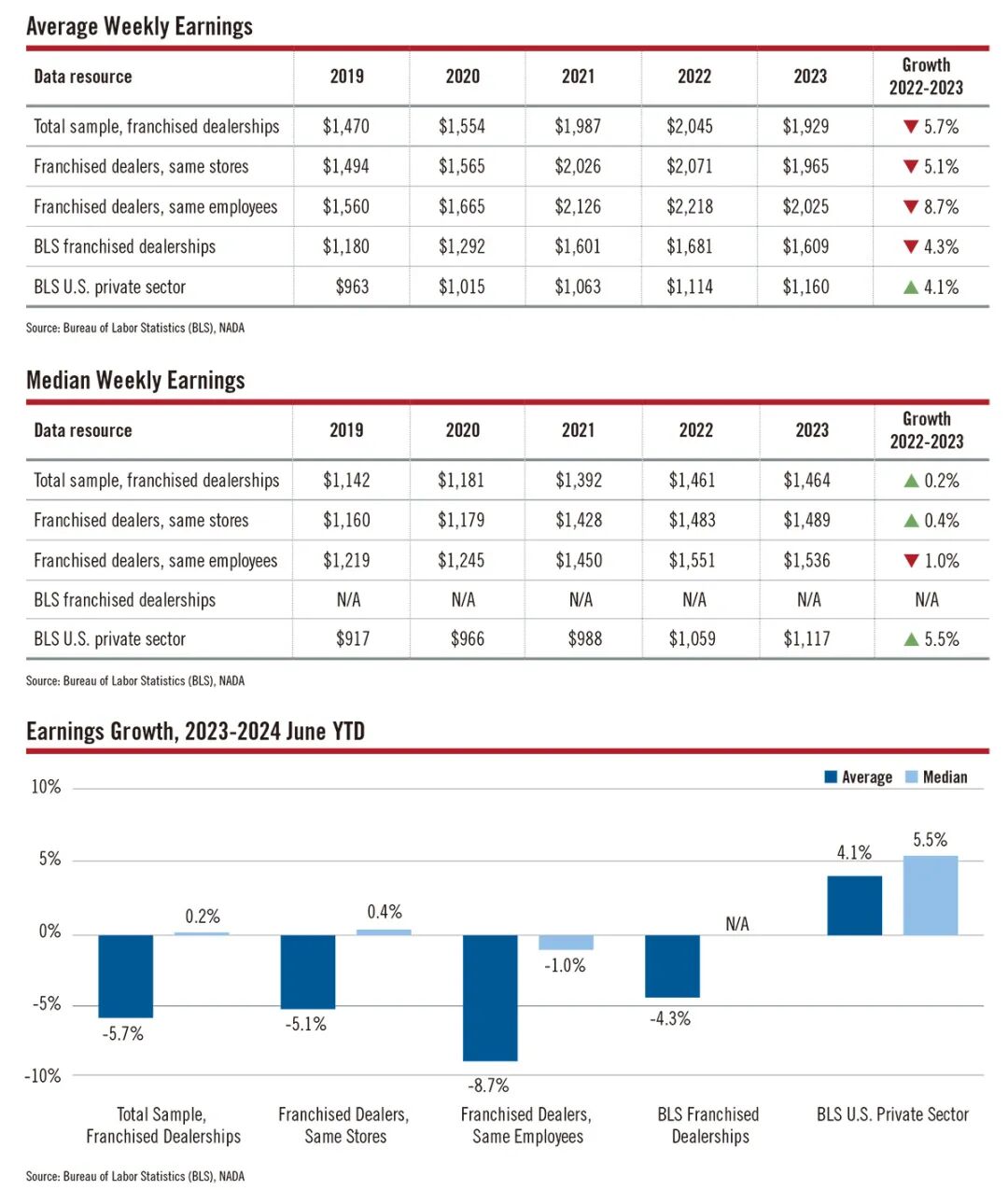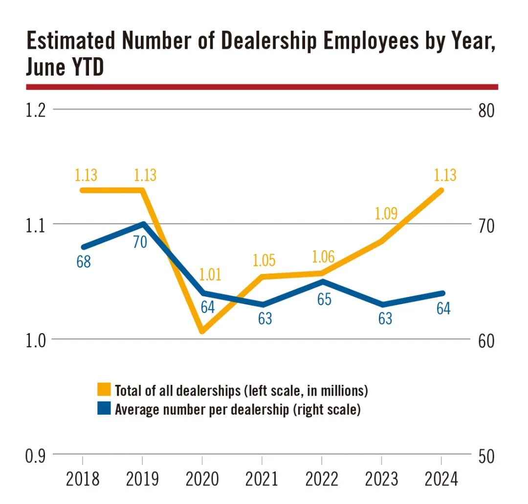 2024年上半年,美国汽车经销商总体就业人数为113万人,高于2023年同期的109万人,和2019年的113万人持平;经销商单店平均人数为64人,和之前两年的人数大致相当。