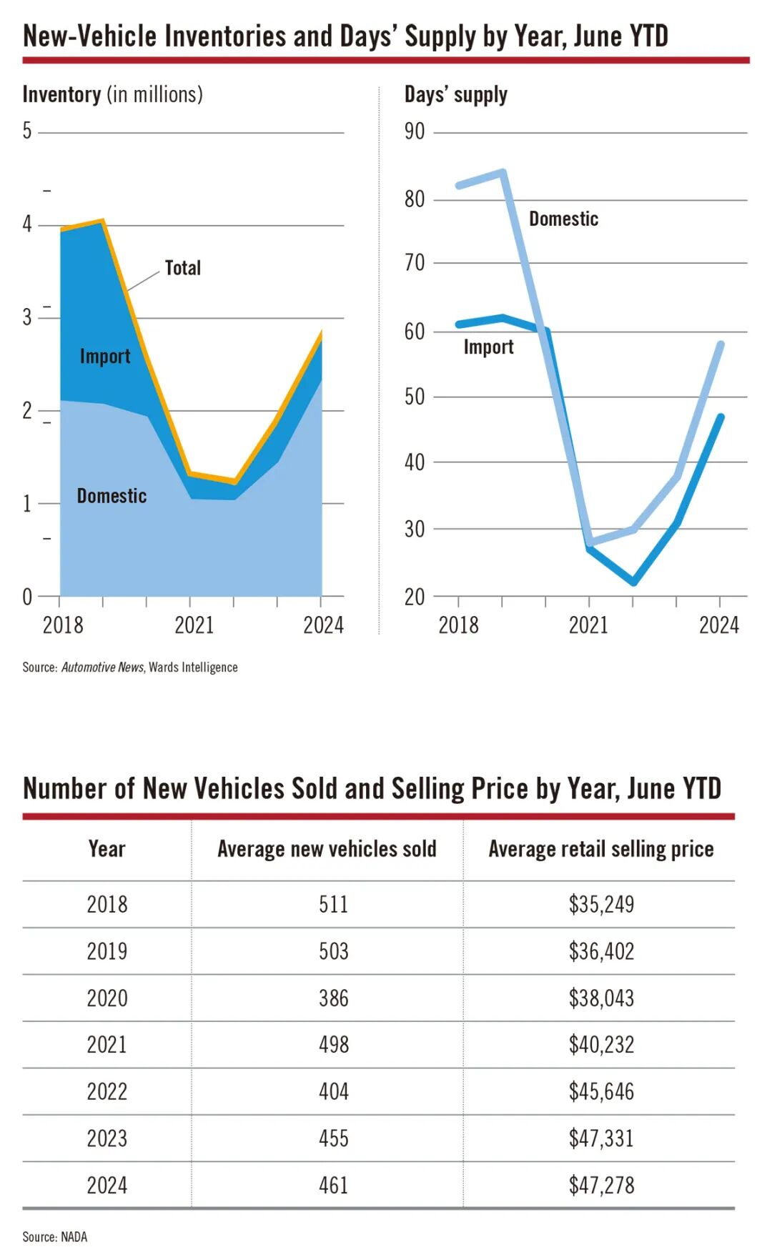 近日,美国汽车经销商协会(NADA)发布了美国授权经销商2024年度中期报告。2024年度中期报告回顾了2024年上半年汽车零售业所取得的重大里程碑,其中包括:全美16,936家特许轻型汽车经销商销售了780万辆轻型汽车。经销商发出了超过1.33亿份维修订单,包括售后服务和零件销售额超过760亿美元。2024年上半年,新轻型汽车库存继续稳步增长。截至2024年6月底,在库和在途的新轻型汽车库存总计280万辆,同比增长48%。更多的可用车辆库存意味着消费者不必像过去几年一样,长时间等待一辆新车。按品牌划分的车辆供应天数整个行业差异很大,因为需求量大的厂商车辆库存可以快速消化。展望未来,预计车辆库存水平在今年余下的时间里将略有增加。业内将看到月度销售和库存模式,这在疫情和微芯片短缺造成动荡的几年之前被认为是正常的。随着车辆库存水平的增长,OEM激励支出也在增长。根据J.D.Power的说法,2024年6月,单车的平均激励支出总计2695美元,比2023年6月增长了55%。尽管如此,库存水平因OEM而异,那些拥有更多可用库存的OEM在2024年下半年可能会有更高的激励支出。新车平均交易价格2024年6月底大致趋稳。上半年新车平均交易价格同比减少了53美元,下降了0.1%,而去年则是增长3.7%。预计在2024年剩余时间里,平均交易价格将持平或略有上升。