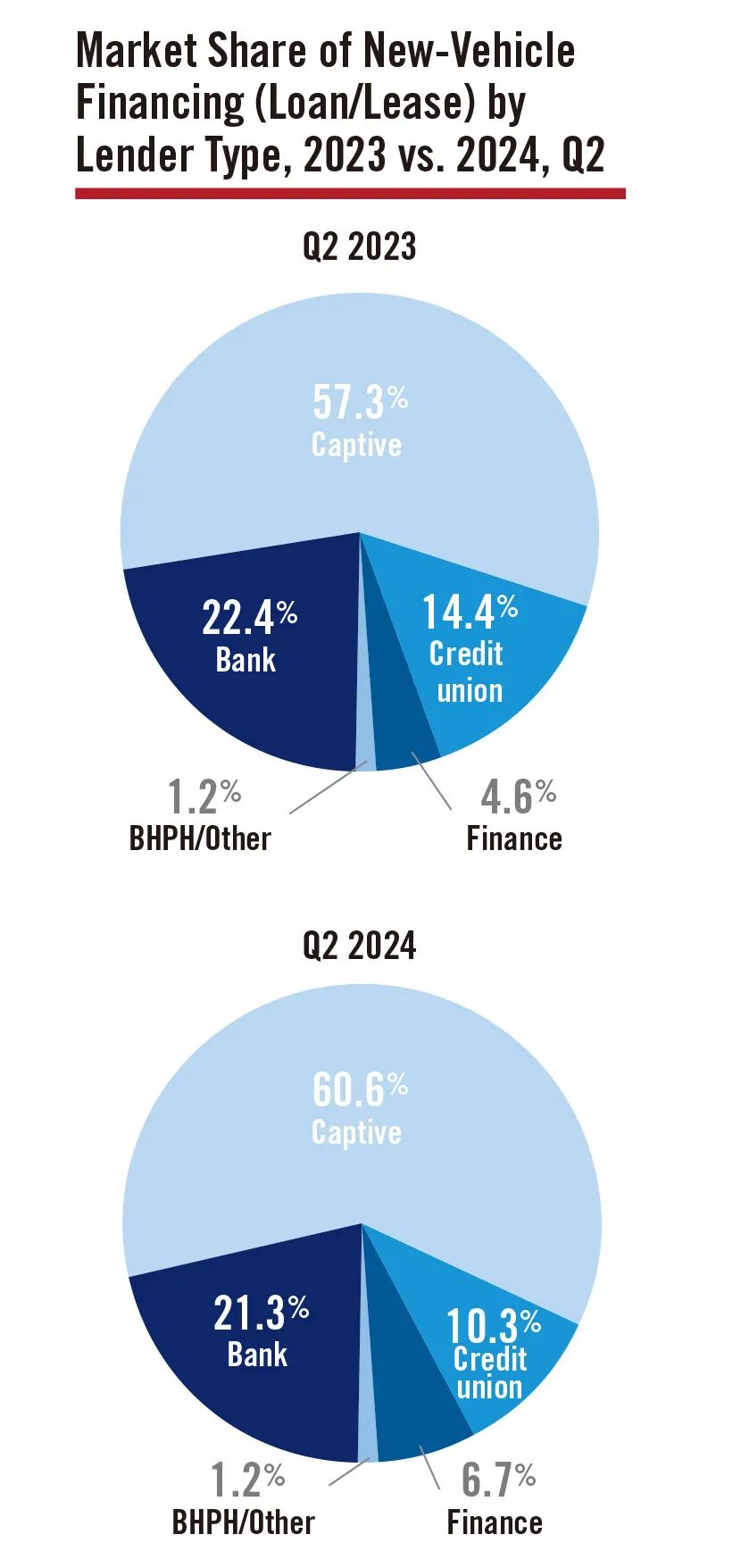 2024年上半年,在新车金融的市场份额中,占比最大的是专属金融公司,占比为60.6%;而2023年上半年这一数据为57.3%。