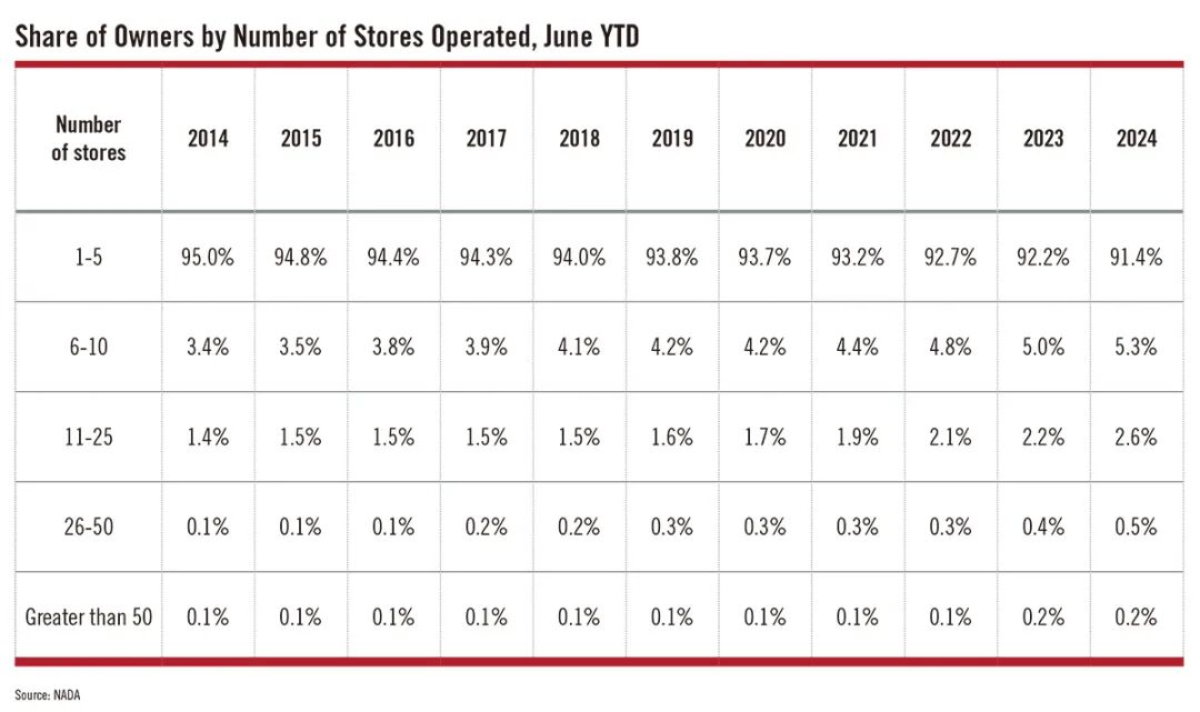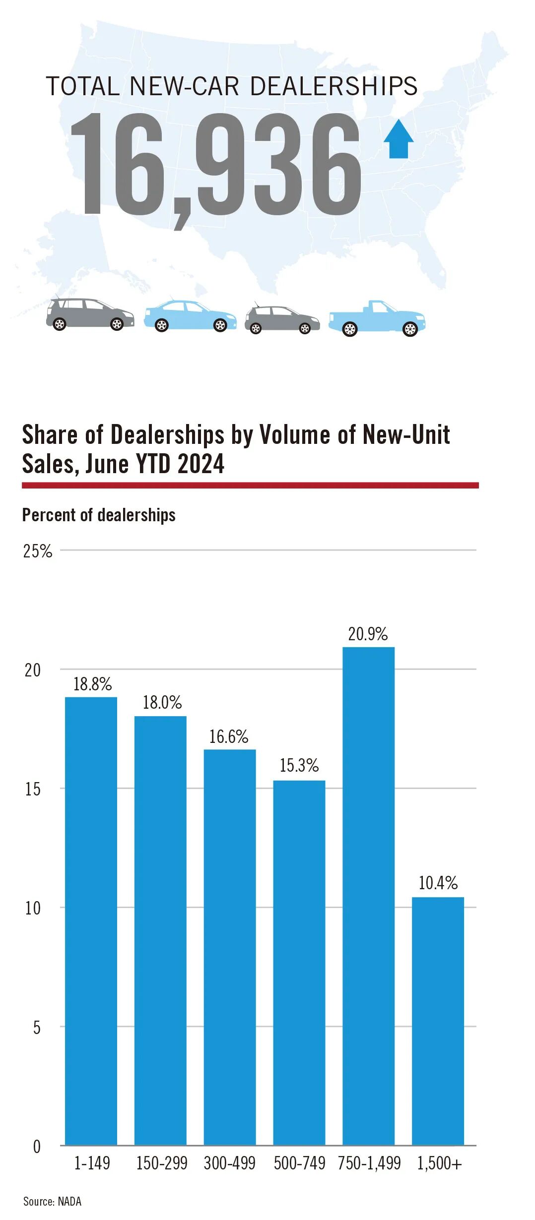根据NADA数据统计显示,全美50个州截至2024上半年的授权经销商数量共计16,936家,和近几年同期的数据相比变化不大。其中单店销量在1500辆以上的经销商占比为10.4%;占比最高的是销量在750~1499辆的经销商,达到20.9%;除单店销量在1500辆以上的经销商之外,占比最低的是销量在500~749辆的经销商,为15.3%。