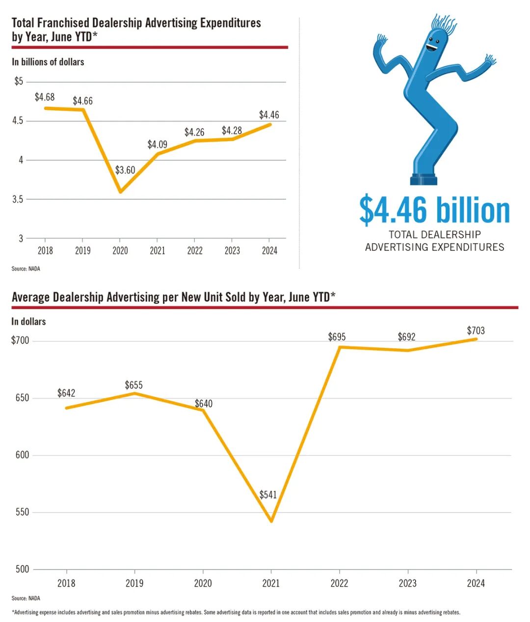 2022年上半年,美国授权经销商广告总支出为44.6亿美元,单店平均每辆新车的广告费支出攀升至703美元,为2015年之后最高。近7年中单店平均每辆新车广告费支出最低的是2021年,为541美元。