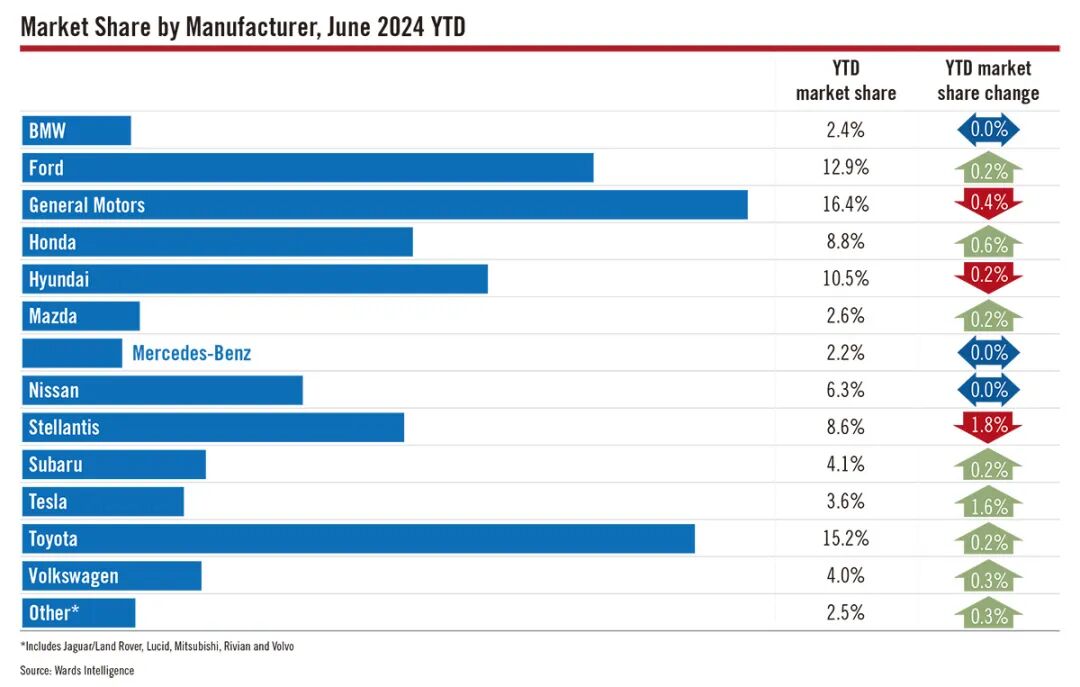 从2024年上半年各品牌市场占有率来看,占比最高的依次为通用、丰田和福特,占有率依次为16.4%,15.2%和12.9%。