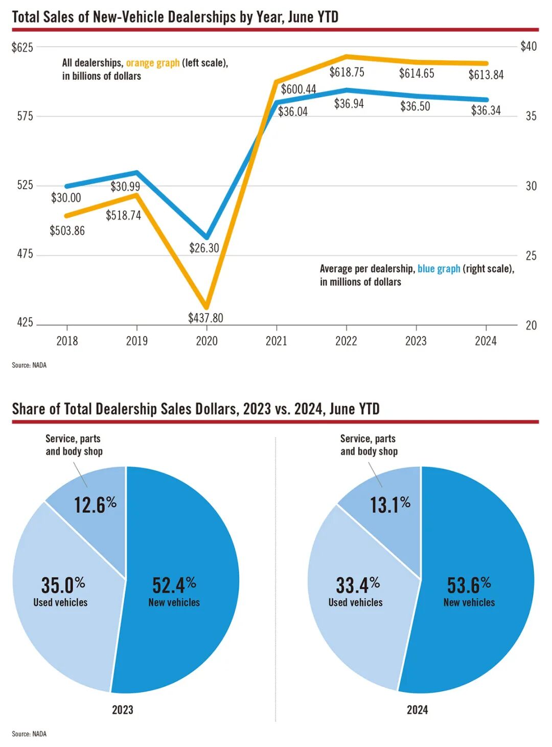 如上图所示,2024年上半年美国汽车经销商销售总额为6138.4亿美元,平均每个经销商的营业额为3634万美元。从销售额数据来看,2024年上半年,销售额占比最高的是新车,达到53.6%;销售额占比最低的是售后服务,为13.1%;二手车业务销售额占比为33.4%。从最近8年的半年度新车经销商销售总额来看,无论是总量还是单个经销商,2022年的销售总额为最高,为6187.5亿美元,单个经销商的平均销售额为3694万美元。