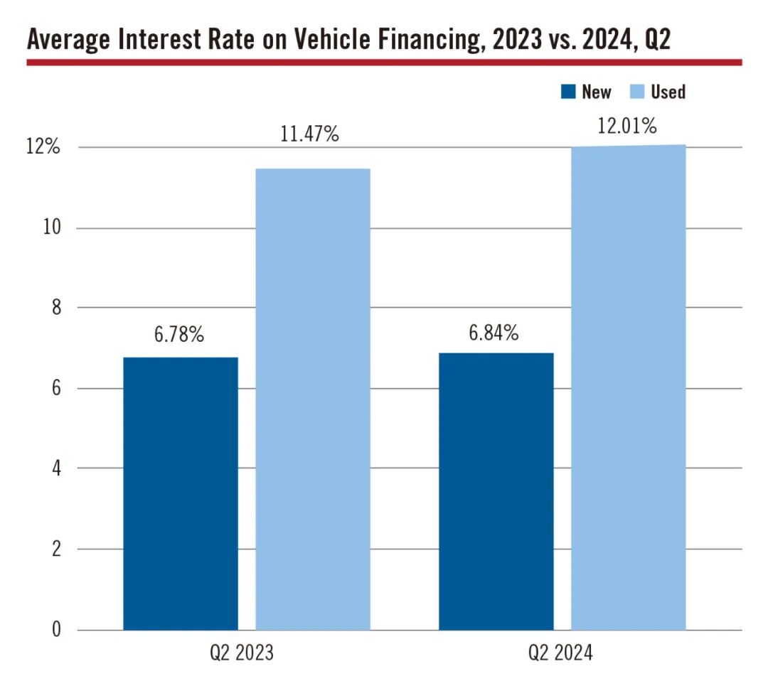 从2023年和2024年第二季度平均贷款利率上看,新车和二手车利率略有增长,分别为6.84%和12.01%。
