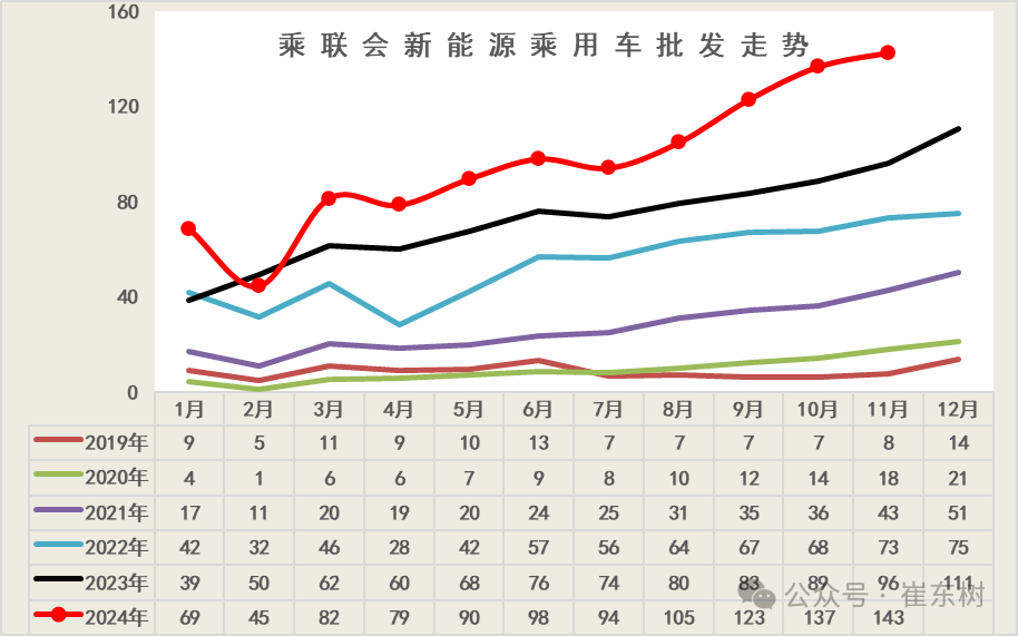 2024年11月新能源乘用车批发销量达到143万辆,超越历史最高水平。 由于春节因素和降价干扰,1月的新能源走势较弱,2月回落较大,年初的新能源走势不强。3-8月市场逐步恢复增长,政策补贴驱动9-11月环比增长巨大,持续突破月度历史高点。