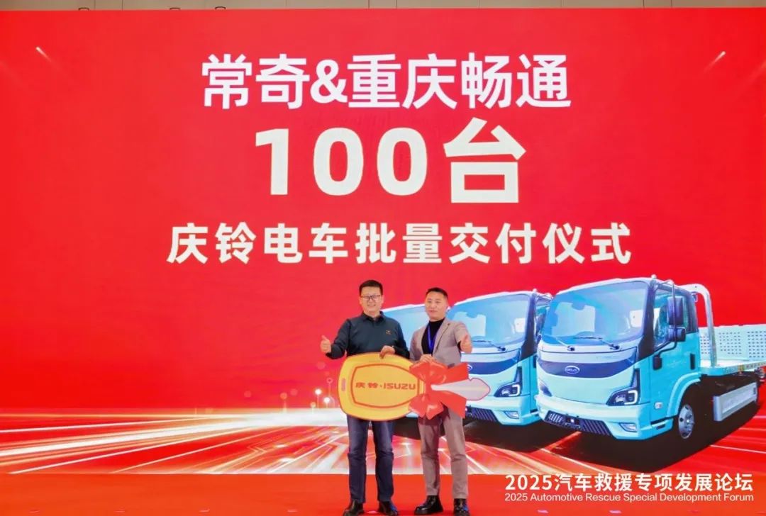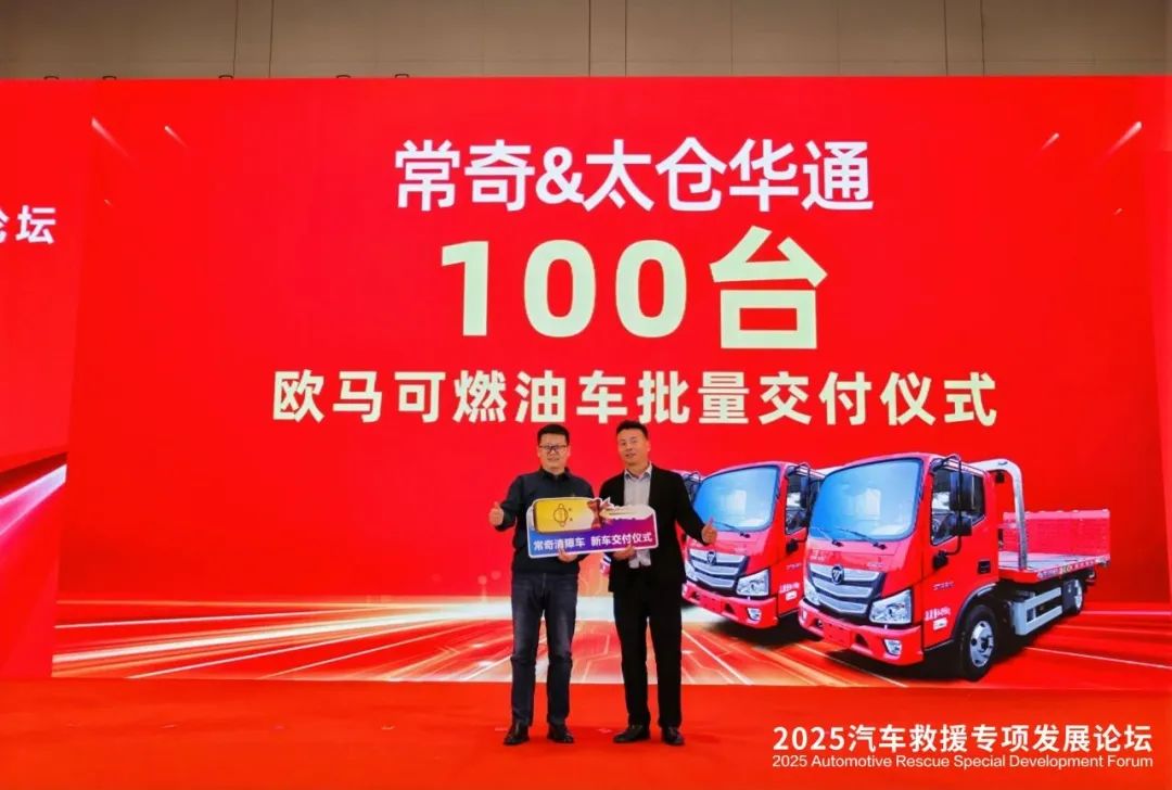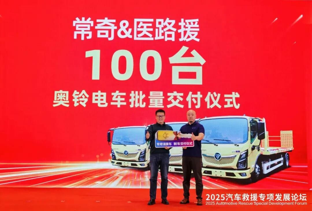 随后举行了新车批量交付仪式,中汽高科与医路援、太仓华通、重庆畅通分别进行了奥铃电车、欧马可油车、庆铃电车的交付。